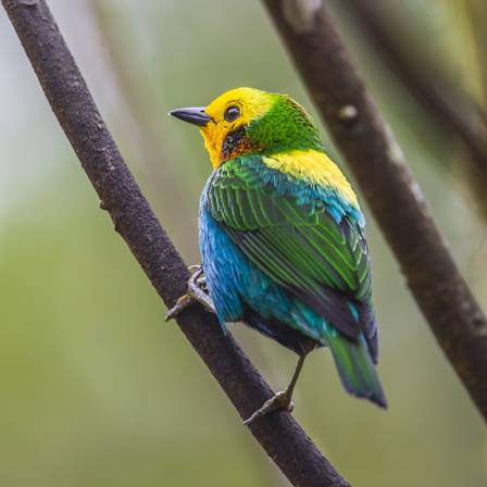 A South American songbird, the male is a shimmering turquoise jewel that perches at the top of the rainforest canopy to catch the sun.