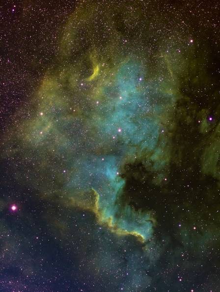 The pulsar's core can be pinpointed by tracing ripple-like patterns leading to a brilliant dot at the center. This core emits winds propelling the surrounding gas and dust shell outward rapidly. Within this cosmic ballet, yellow-white and green filaments intertwine into grand loops, delineating the territories of dust grains.