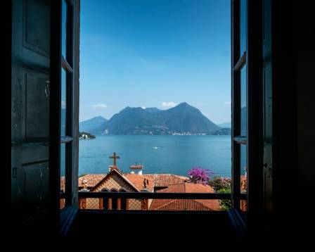 Et vakkert formet buet vindu trekker øyet oppover og fanger skjønnheten til himmelen og landet i det fjerne.